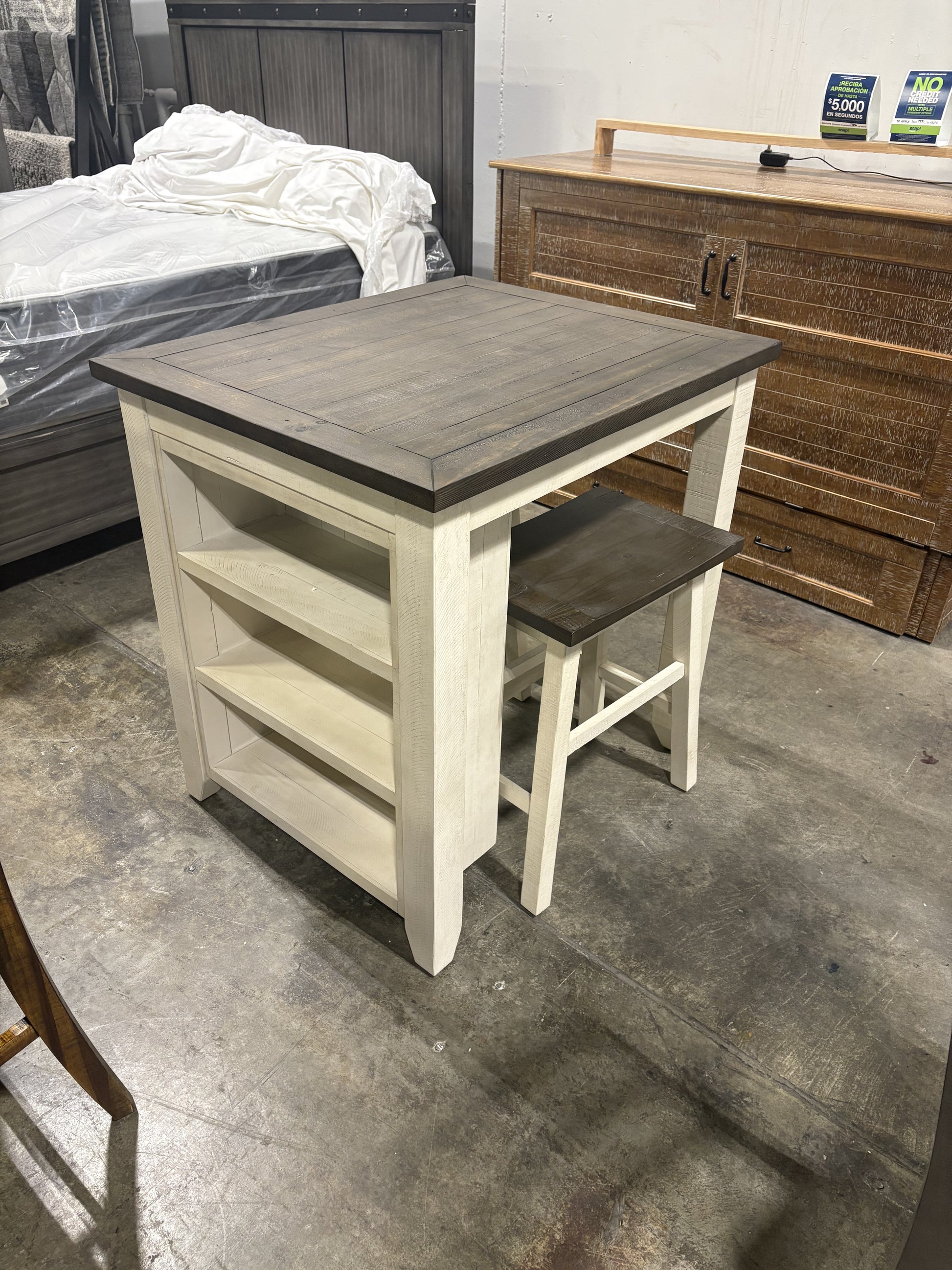 Expertly designed and crafted, this 3 piece counter height dining set offers convenient storage with built-in side shelves. Scratch & Dent discount brings the price down from $999 to $499, making it a stylish and affordable addition to your dining space.