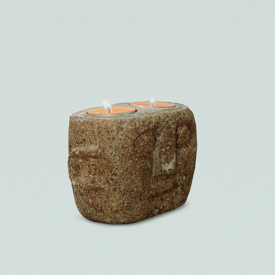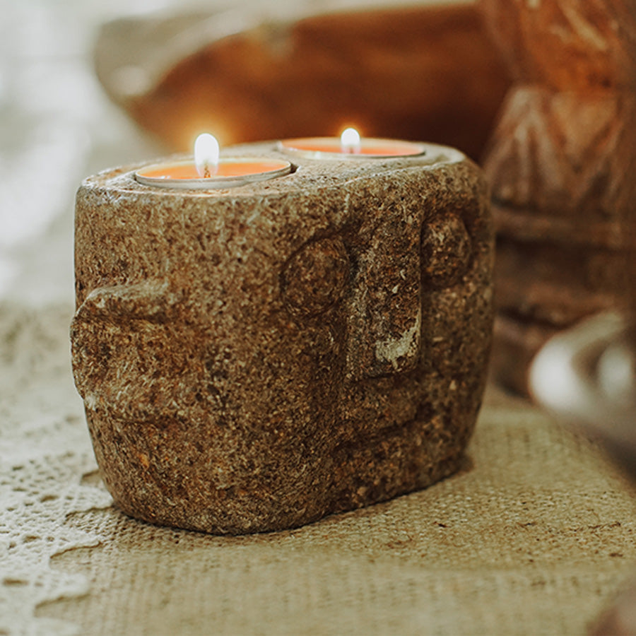 Elevate your home decor with the Kiowa Carved Stone Tealight Holder, a unique and earthy addition to your living space. Hand-carved from natural stone, each piece showcases a bold face design, making it a stunning conversation starter. Designed to hold two tealights, this candle holder creates a warm, ambient glow that complements its rustic texture and timeless appeal.