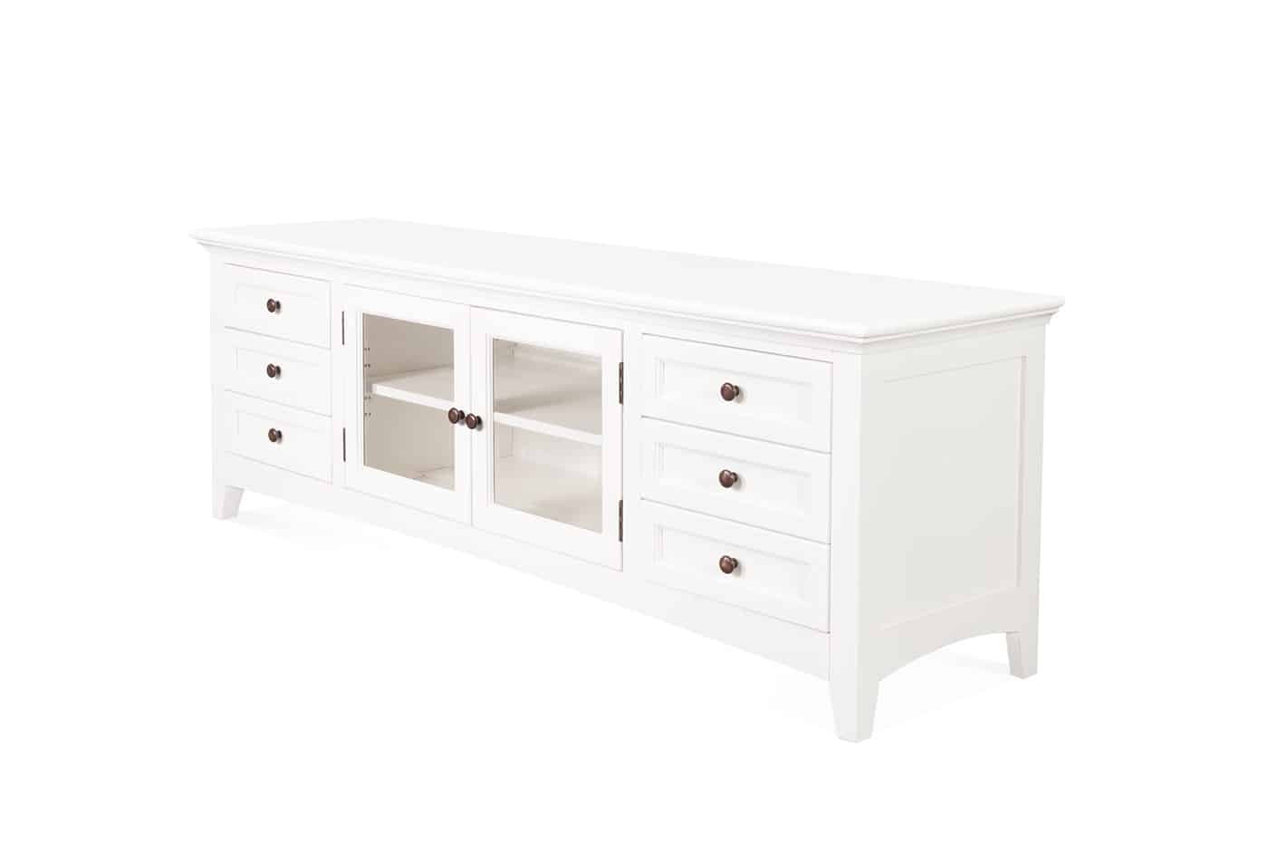 This New Traditions Plasma TV Stand includes six drawers in addition to shelf space covered by glass paneled hinge doors.