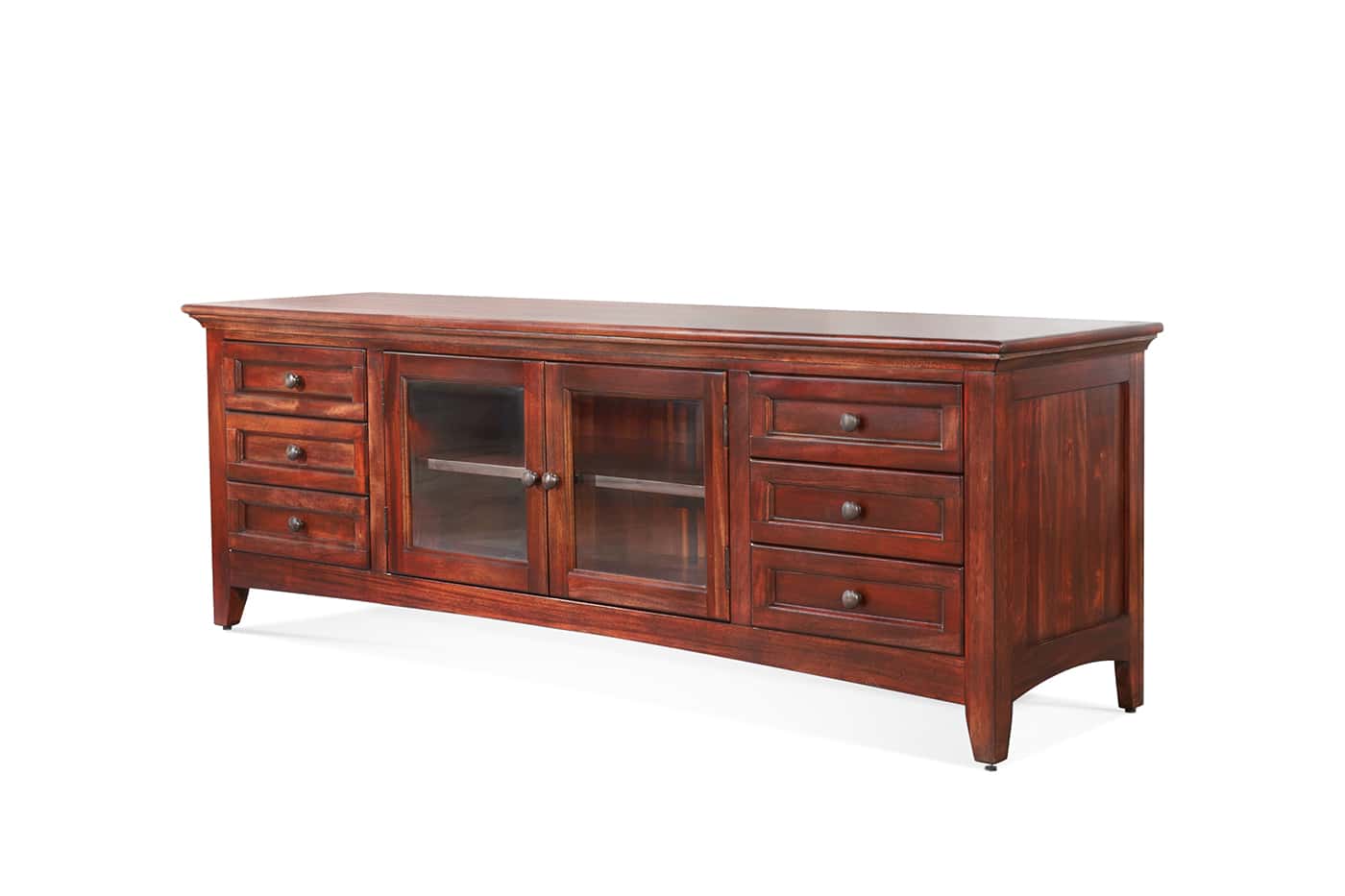 This New Traditions Plasma TV Stand includes six drawers in addition to shelf space covered by glass paneled hinge doors.